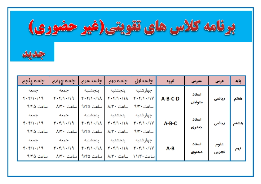 آخرین اخبـار علمی روز و اطلاعیه، آزمـون های آنلاین، ارائه نمرات کلاسی دانش آمـوزان، نمایش دانش آموزان بـرتر کلاسی به صـورت مـاهانه، نمونـه سـوالات، تماس با مشاور و مدیریت، پرسش و پاسخ اینترنتی